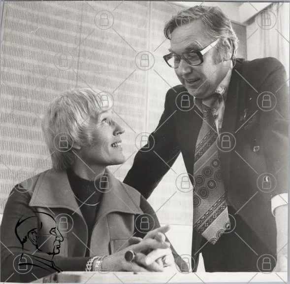 svartvitt, foto, kvinna, man, 1970-tal, kläder, glasögon, samtal, leende, inomhus, kontor, retro, stil, frisyr, accessoarer, bord, interiör, professionell, uttryck, relation, kommunikation, vintage, ansiktsuttryck, kroppsspråk, social, samarbete, diskussion, affärsmöte, personlig, interaktion