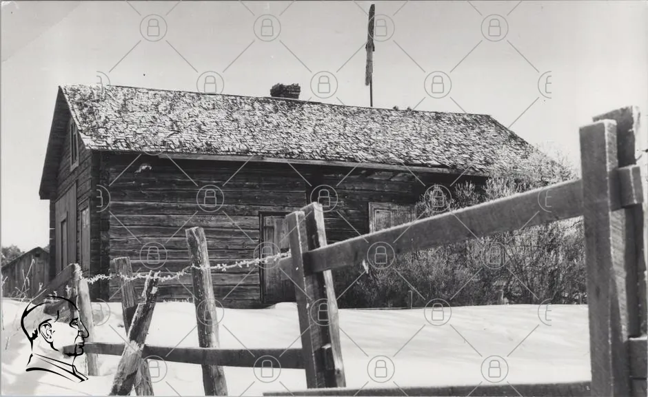 stuga, trä, tak, snö, vinter, landskap, stängsel, dörrar, fönster, gammal, natur, svartvit, byggnad, rustik, enslig, flaggstång, gräs, himmel, moln, landsbygd, traditionell, avskild, stillhet, lugn, historia, kultur, arkitektur, utomhus, fotografi, skandinavisk