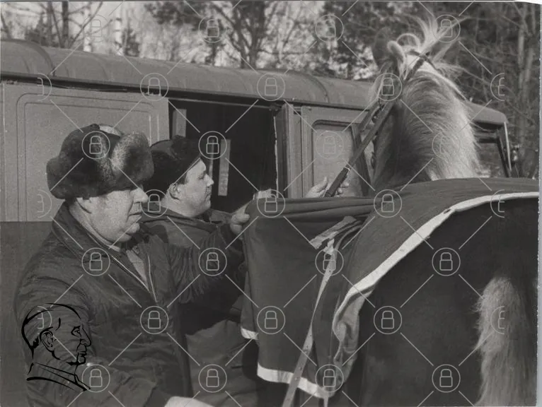 häst, män, vinter, kläder, fordon, svartvitt, landskap, arbete, tradition, djur, transport, bondgård, hästutrustning, mössor, jackor, natur, mänsklig aktivitet, utomhus, samarbete, nostalgi
