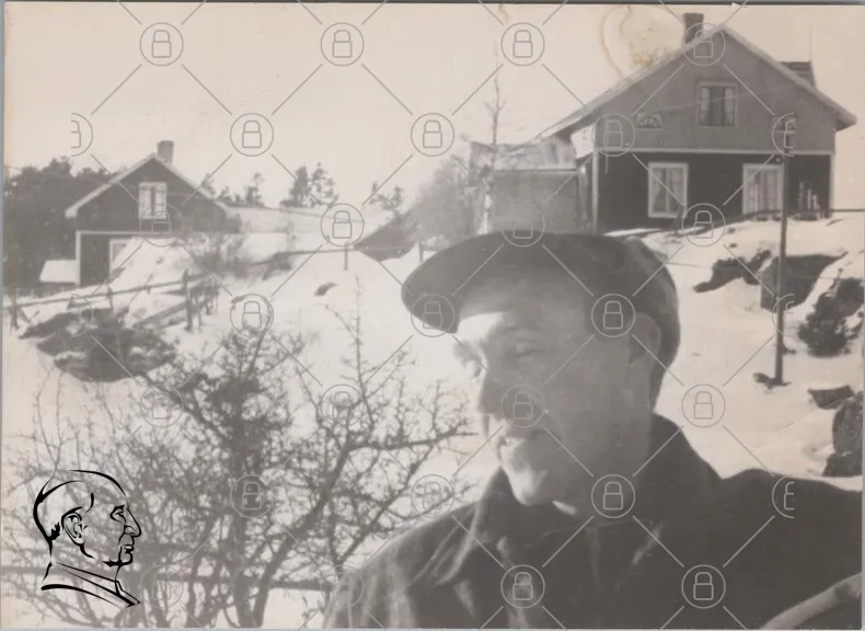 vinter, snö, man, hus, träd, keps, landskap, gammalt foto, svartvitt, staket, buskar, vinterlandskap, byggnader, utomhus, porträtt, skog, himmel, kläder, skugga, tak, fönster, dörr, gård, kulle, person, natur, bakgrund, snötäckt, by, traditionell