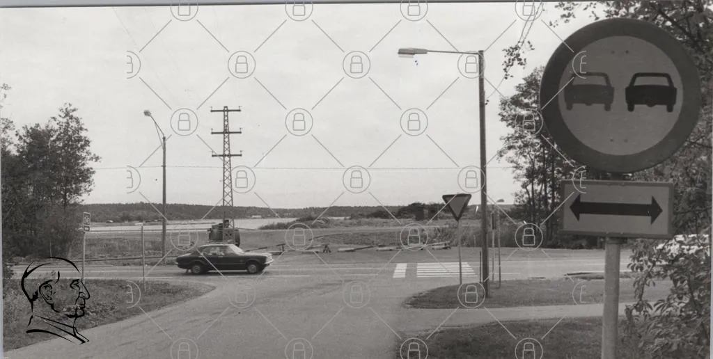 väg, korsning, bil, elstolpe, landskap, sjö, träd, skylt, svartvit, natur, trafik, vägskylt, gräs, himmel, moln, vägkant, asfalt, byggnader, avstånd, stillhet