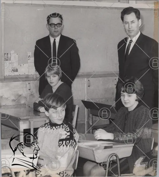 klassrum, elever, lärare, 1960-tal, svartvitt, skola, bord, stolar, pojkar, flickor, kläder, undervisning, pedagog, barn, vuxna, interaktion, lärande, traditionell, utbildning, retro, fotografi, gruppbild, ansikten, miljö, inredning, koncentration, studier, samtal, blickar