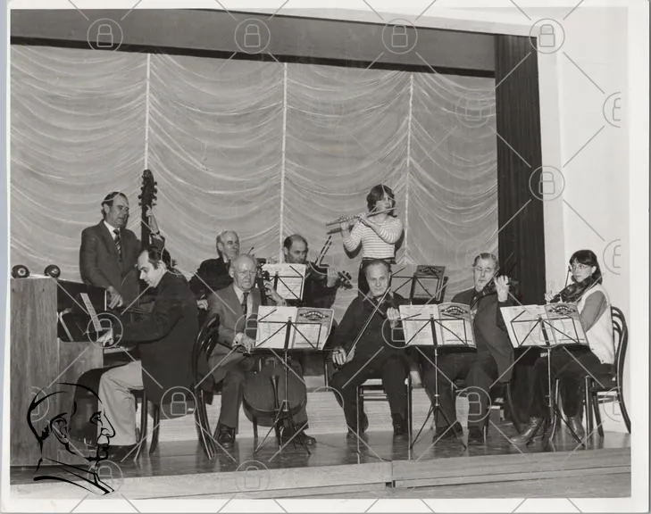 musiker, orkester, konsert, piano, fiol, flöjt, notblad, scen, svartvitt, uppträdande, 1970-tal, klassisk musik, ensemble, publik, instrument, musikaliskt, underhållning, traditionell, kultur, samspel