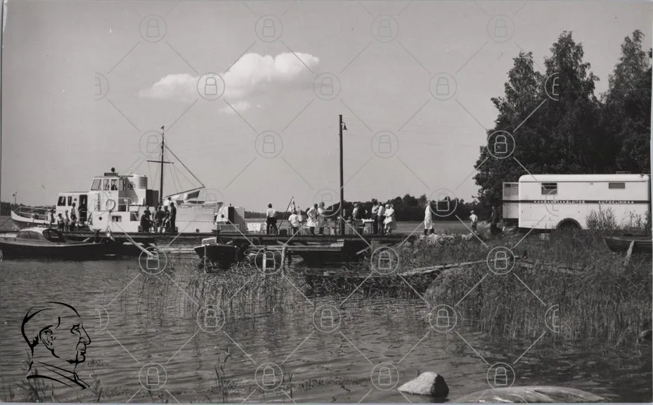 båt, brygga, människor, vatten, himmel, moln, trä, strand, natur, svartvit, sommar, kaj, landskap, växter, båtar, lastning, avlastning, aktivitet, rekreation, fotografering, historia, gammal, tradition, resande, transport, sjöfart, kajplats, skärgård, lugn, stillhet