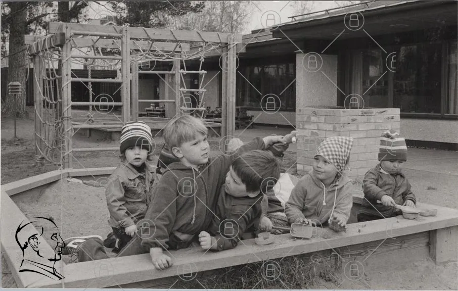 barn, lekplats, svartvit, klätterställning, skola, utomhus, lek, kompisar, 1960-tal, barnkläder, skratt, gemenskap, barndom, trä, byggnader, natur, vänskap, aktivitet, roligt, minnen