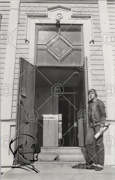 ingång, dörr, byggnad, man, kläder, 1970-tal, svartvitt, trä, fönster, arkitektur, utomhus, stil, entré, öppet, skylt, dokument, jeans, jacka, interiör, gammal, traditionell, design, struktur, samhälle, historia, fotografi, person, stående, miljö, detalj