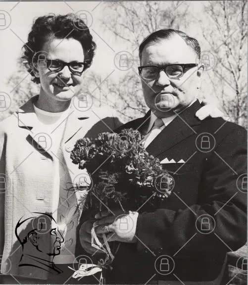par, blommor, svartvitt, porträtt, kvinna, man, glasögon, klänning, kostym, bukett, leende, utomhus, träd, 1960-tal, vintage, familj, minne, fest, kärlek, relation, tradition, firande, nostalgisk, gammal, fotografi, romantik, stil, elegans, samhörighet