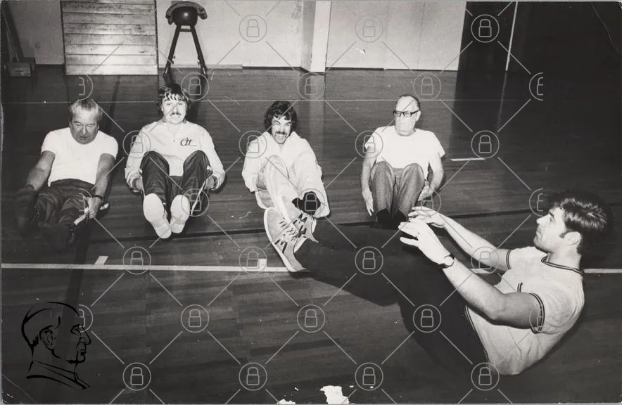 träning, gym, män, sit-ups, svartvitt, sport, motion, grupp, inomhus, 1980-tal, fitness, hälsa, styrka, övningar, samarbete, leenden, kläder, svett, aktivitet, gemenskap, kropp, balans, fokus, motivation, ledare, instruktör, stil, tradition, gemensam träning, roligt