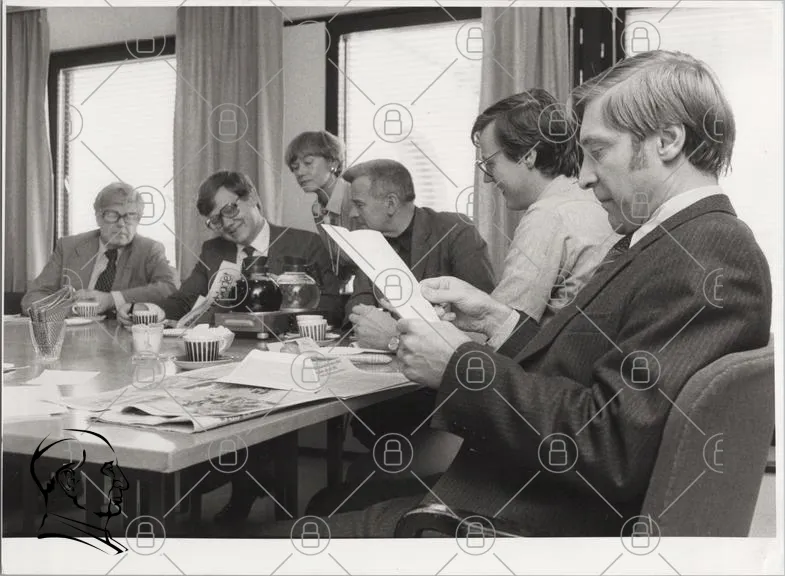 möte, konferens, män, papper, dokument, skrivbord, glas, kaffe, tidningar, fönster, diskussion, 1970-tal, svartvitt, kläder, ansiktsuttryck, grupp, samarbete, kontor, professionell, affärsmän