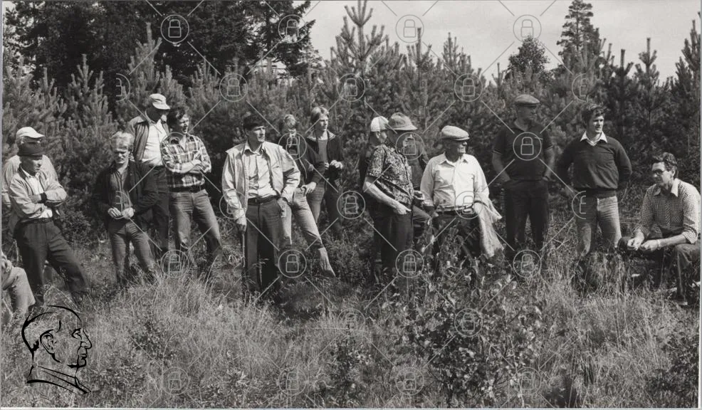 grupp, människor, skog, natur, kläder, svartvitt, fotografering, utomhus, samling, män, kvinnor, trä, landskap, promenad, tradition, 1970-tal, stil, vandrare, stämning, gemenskap, aktivitet, observation, fritid, vänner, äldre, ungdomar, leende, diskussion, avkoppling, minnen