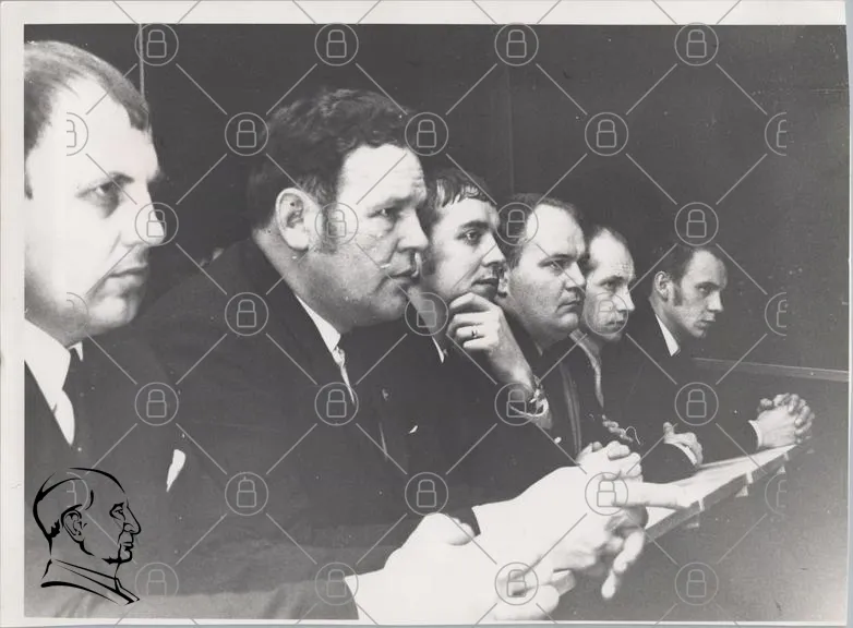 möte, män, kostymer, svartvitt, 1970-tal, diskussion, ansikten, allvarliga, bord, grupp, professionella, utredning, politik, historia, dokumentär, formell, presentation, uttryck, samarbete, ledarskap, samhälle