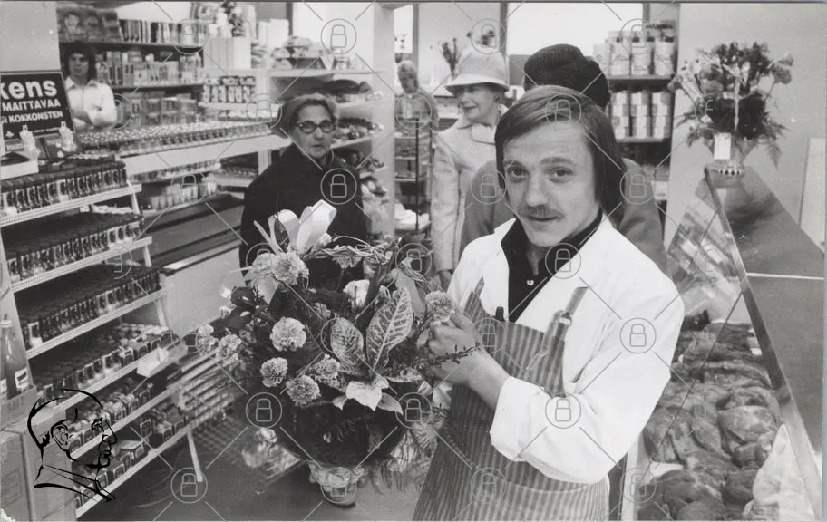 blommor, butik, man, kvinna, blombukett, 1960-tal, kläder, handel, kunder, florist, blommorarrangemang, retro, interiör, leende, service, varor, hyllor, blomsterbutik, stil, mode, affär, samhälle, tradition, växter, present, blomster, svartvit, ansiktsuttryck, atmosfär, socialt