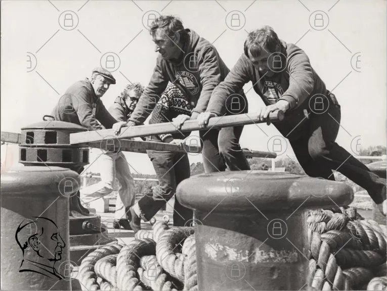människor, arbete, rep, båt, hamn, vintage, svartvit, teamwork, kraft, marina, utrustning, sjöfart, tradition, män, kvinnor, aktivitet, utomhus, sommar, segling, historia, industri, ansträngning, samarbete, roder, kaj, fiske, båtbyggnad, kultur, gemenskap, handarbete