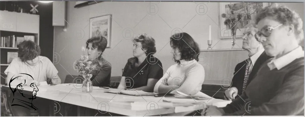 kvinnor, möte, 1960-tal, svartvitt, diskussion, bord, anteckningar, kläder, interiör, grupp, fokus, ansikten, samhälle, utbildning, samarbete, tradition, stil, retro, fotografi, historia