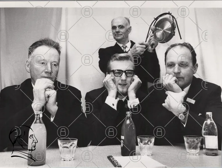 svartvit, män, bord, glas, flaskor, skämt, skratt, kläder, hatt, köksredskap, leenden, 1960-tal, gruppfoto, humor, fest, socialt, samling, uttryck, interaktion, retro