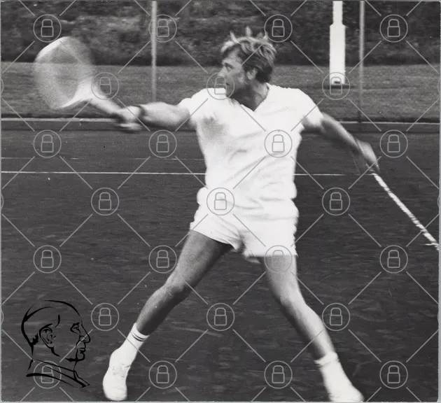tennis, spelare, racket, vit, kläder, sport, gräs, bana, rörelse, träning, 1960-tal, man, action, tävling, idrott, utomhus, fotarbete, koncentration, teknik, match