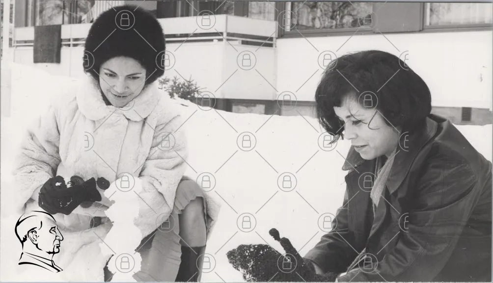 snö, kvinnor, vinter, svartvitt, kläder, leende, utomhus, snöboll, träd, byggnad, handskar, frisyr, ansiktsuttryck, vänskap, 1960-tal, fotografering, natur, kallt, aktivitet, roligt