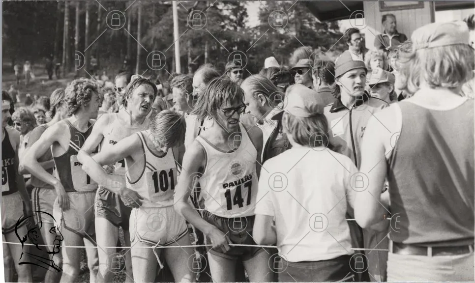 löpning, tävling, idrott, män, nummer 101, nummer 147, publik, 1970-tal, sportkläder, svett, fokus, tröjor, nummerlappar, skog, mänsklig aktivitet, gemenskap, motion, tävlingsanda, utomhus, historisk, svartvitt, ansiktsuttryck, spänning, prestation, samling, deltagare, evenemang, sport, tradition