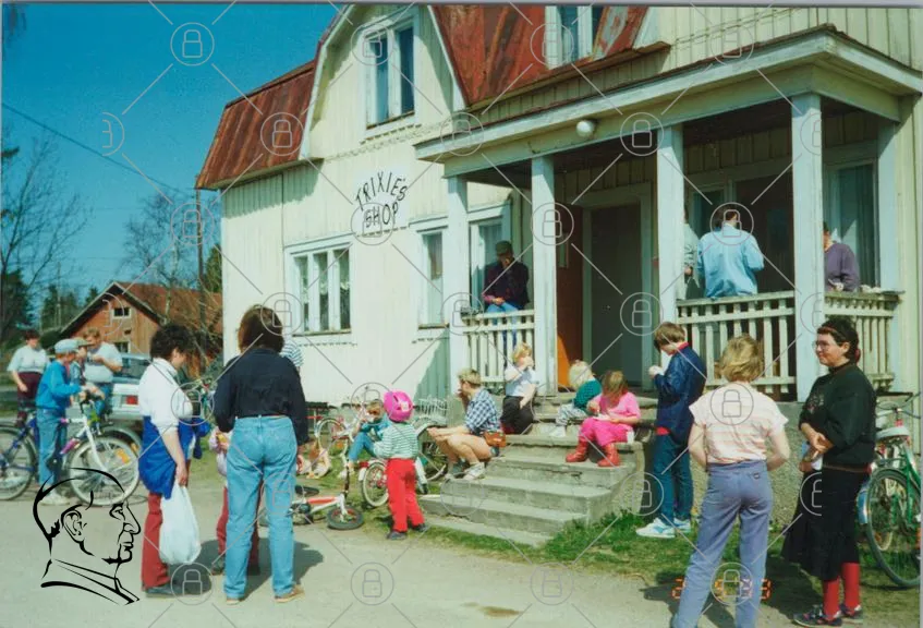 butik, barn, cyklar, trappor, människor, sommar, lek, fritid, kläder, skor, trä, hus, skylt, aktiviteter, utomhus, familj, vänner, skratt, gemenskap, färgglatt, landsbygd, traditionell, roligt, avslappnat, barnlek, samling, soligt, glädje, minnen