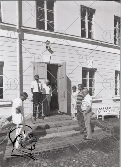 personer, byggnad, dörr, trappa, fönster, kläder, svartvitt, grupp, utomhus, sommar, män, kvinnor, leende, samtal, socialt, historisk, 1900-tal, stil, arkitektur, samling, fotografering, tradition, kultur, interaktion, gemenskap, vänskap, besök, aktivitet, miljö, landskap