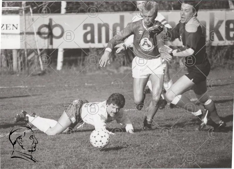 fotboll, spelare, match, mål, boll, gräs, sport, tävling, lag, action, svartvitt, 1980-tal, målvakt, tackling, publik, tröjor, nummer, domare, skott, fallande, intensiv, utmaning, fotbollsplan, spelmoment, idrott, motion, laganda, teknik, strategi, adrenalinkick