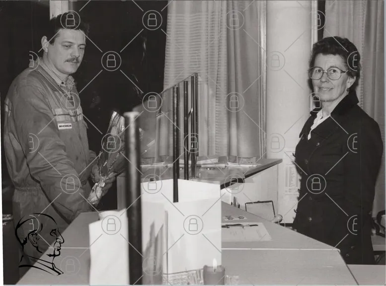 man, kvinna, blommor, kontor, fönster, glas, disk, svartvitt, interiör, samtal, present, leende, kläder, 1980-tal, service, möte, professionell, vänskap, gest, arbetsplats, tradition, socialt, kommunikation, uppvaktning, personal, kund, reception, äldre, modern, stil, uttryck