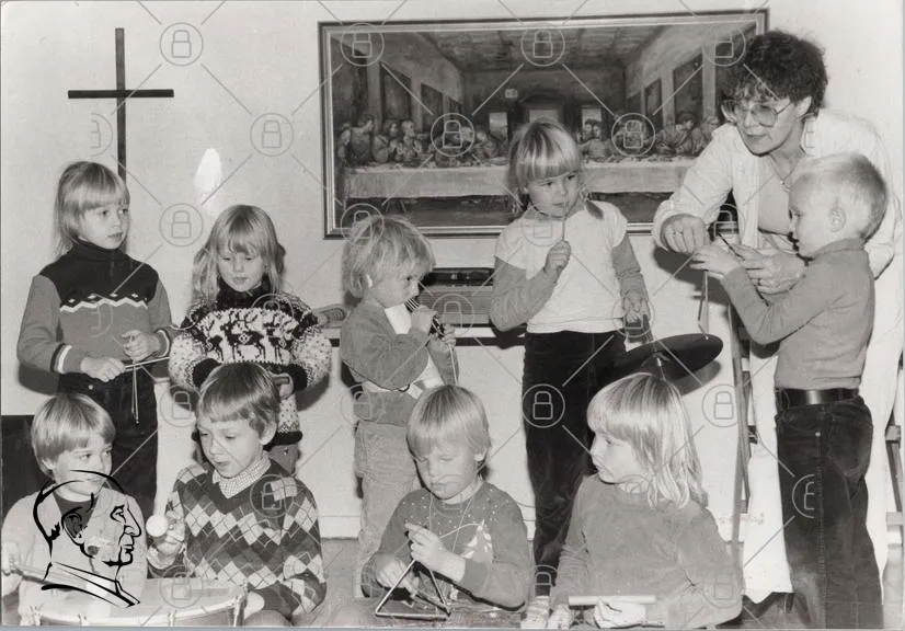 barn, lek, kreativitet, konst, 1980-tal, svartvit, inomhus, målning, grupp, aktiviteter, hantverk, skola, samarbete, glädje, tradition, nostalgi, utbildning, socialt, gemenskap, handarbete, minnen