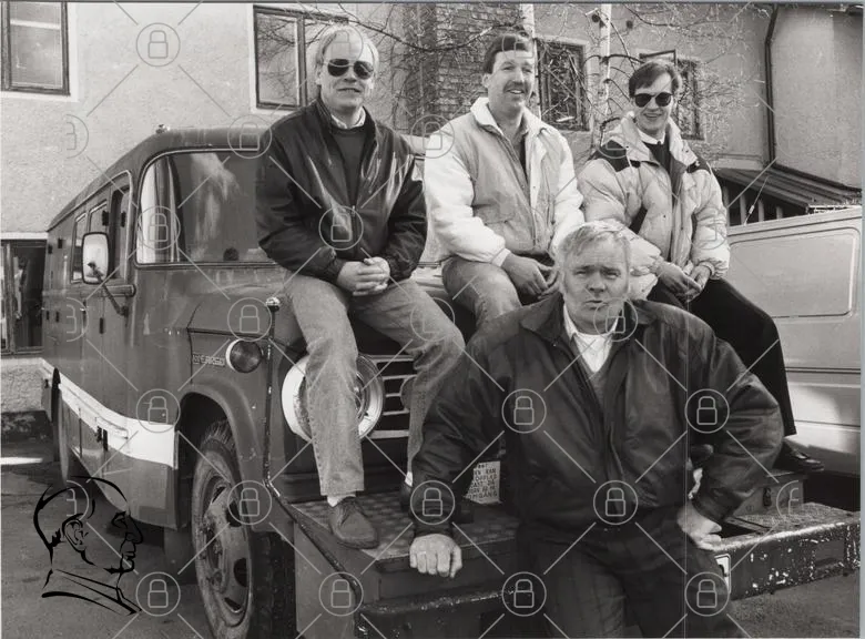 svartvit, gruppfoto, fyra män, lastbil, jackor, solglasögon, utomhus, vintage, 1980-tal, avslappnad, byggnad, träd, leende, sittande, stående, jeans, skägg, mustasch, läderjacka, vinterjacka, fönster, trappa