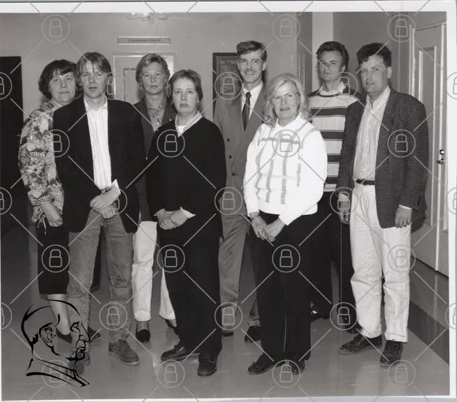 gruppfoto, svartvitt, människor, formella kläder, inomhus, åttiotal, nittiotal, män, kvinnor, stående, porträtt, kontor, arbetsplats, vintage, retro, grupp, team, kollegor, möte, samling