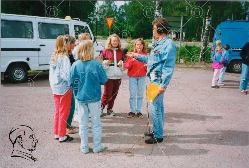 barn, intervju, mikrofon, kläder, 1990-tal, utomhus, grupp, vuxen, fordon, vägskylt, skog, leende, ljudutrustning, jeans, t-shirt, samtal, ungdomar, fotografering, aktivitet, fritid