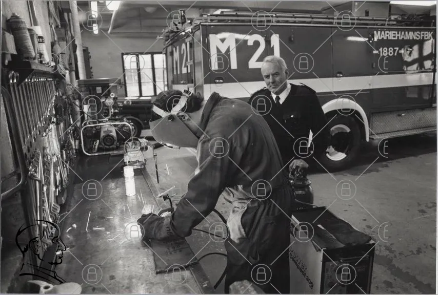 svetsning, verkstad, brandbil, M21, arbetare, skyddsutrustning, svetsmask, arbetskläder, verktyg, industri, arbetsplats, säkerhet, metallarbete, brandman, interiör, maskiner, arbetsmiljö, svetsbord, svetsutrustning, arbetsprocess