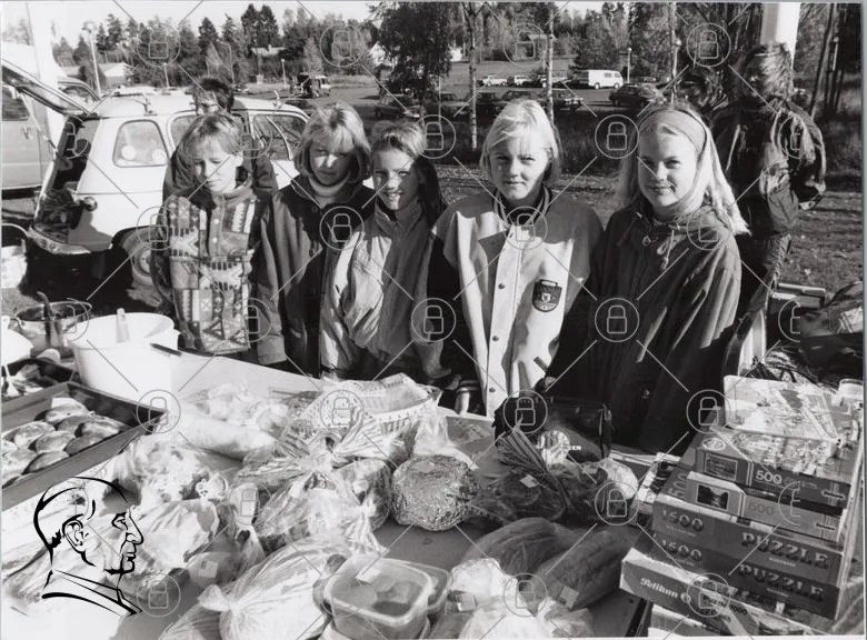 flickor, försäljning, mat, bakverk, marknad, svartvit, utomhus, bord, sommar, kläder, leenden, gemenskap, ungdomar, aktiviteter, natur, bilar, skog, evenemang, tradition, handla, lokal, nöje, samarbete, skola, vänner, produkter, fest, samling, glädje, ungdomsgrupp