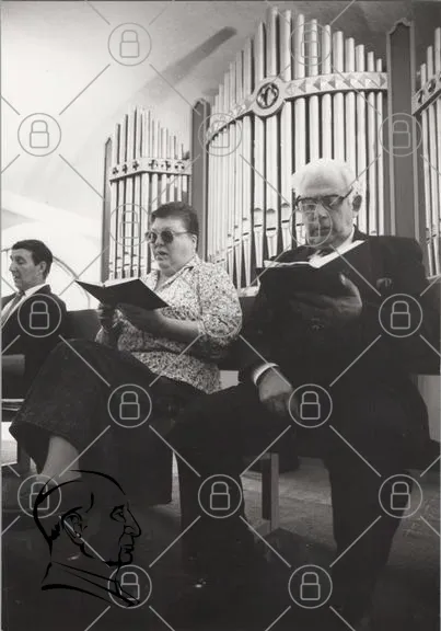 kyrka, orgel, sång, människor, gammal, svartvitt, bön, samling, tradition, andakt, musik, gemenskap, äldre, bok, glasögon, kläder, sittande, man, kvinna, stämning, högtid