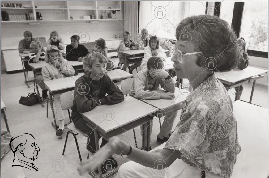 klassrum, elever, lärare, undervisning, skola, 1980-tal, svartvitt, koncentration, skrivbord, stolar, barn, ungdomar, lärande, pedagogik, interaktion, ansiktsuttryck, fokus, lärande miljö, traditionell utbildning, grupparbete, skolsituation
