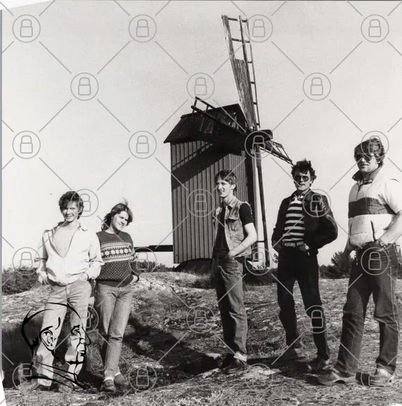 Från vänster Kaj Törnroos, Karina Eskills, Kjäll Törnroos, Jan Henriksson och Roland Henriksson vid kvarn på Kumlinge.