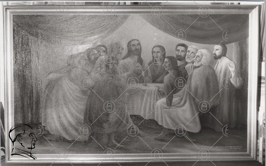 Jesus, sista måltiden, apostlar, biblisk, religiös, målning, konstverk, historia, tradition, kristendom, samling, bord, vin, bröd, ljus, kläder, ansikten, uttryck, kultur, scen, gemenskap, tro, andlighet, symbolik, tidlös, svartvit, klassisk, representation, måleri, detaljer