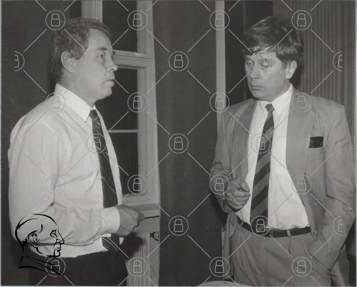 svartvitt, två män, kostymer, slipsar, fönster, konversation, inomhus, formellt, 1980-tal, kavaj, skjorta, möte, diskussion, gardiner, stående
