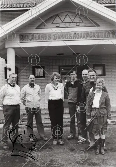 grupp, människor, byggnad, utomhus, svartvitt, skog, skogssällskap, kläder, leende, samarbete, 1980-tal, tradition, förening, aktivitet, gemenskap, fotografering, sport, natur, trä, entré, skylt, skogsvård, historia, landskap, vänskap, samling, utställning, kultur, lokal