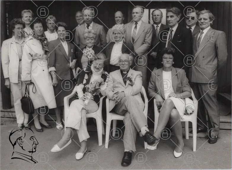 gruppfoto, människor, kläder, svartvitt, leenden, kvinnor, män, sittande, stående, blommor, 1980-tal, fest, samling, porträtt, tradition, familj, vänner, minnen, gammal, stil, ansikten, bakgrund, utomhus, evenemang, gemenskap, glädje, samhörighet, historia, nostalgi, socialt