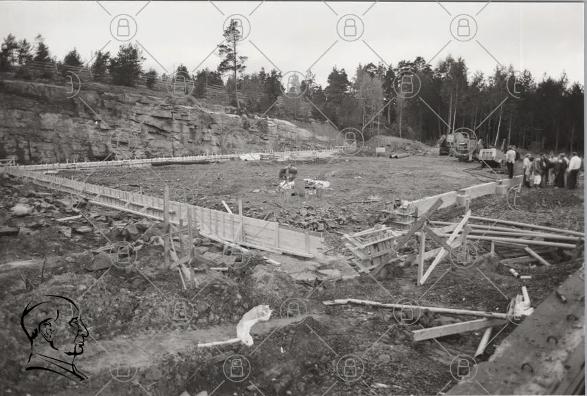 byggarbetsplats, konstruktion, grus, träd, berg, maskiner, arbetare, trä, staket, landskap, natur, grönska, byggmaterial, jord, väg, fundament, projekt, industri, svartvit, utomhus, arbete, byggnation, anläggning, markarbete, sten, byggnadsställning, hund, fordon, skog, planering