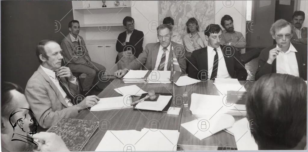 möte, diskussion, kontor, dokument, papper, män, kvinnor, 1980-tal, kläder, skrivbord, anteckningar, professionell, affärsmöte, presentation, grupp, ledarskap, samarbete, beslutsfattande, formell, interaktion, ansiktsuttryck, fokus, arbetsmiljö, team, kommunikation, strategi, planering, organisation, historia