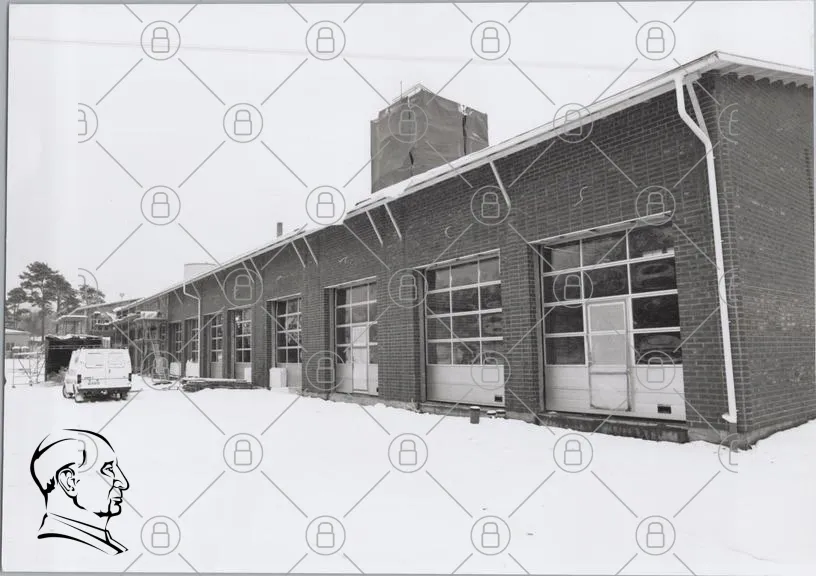tegelbyggnad, garageportar, snö, vinter, industriområde, fönster, tak, byggnad, arkitektur, utomhus, svartvitt, gammal byggnad, lager, fabrik, snötäckt mark