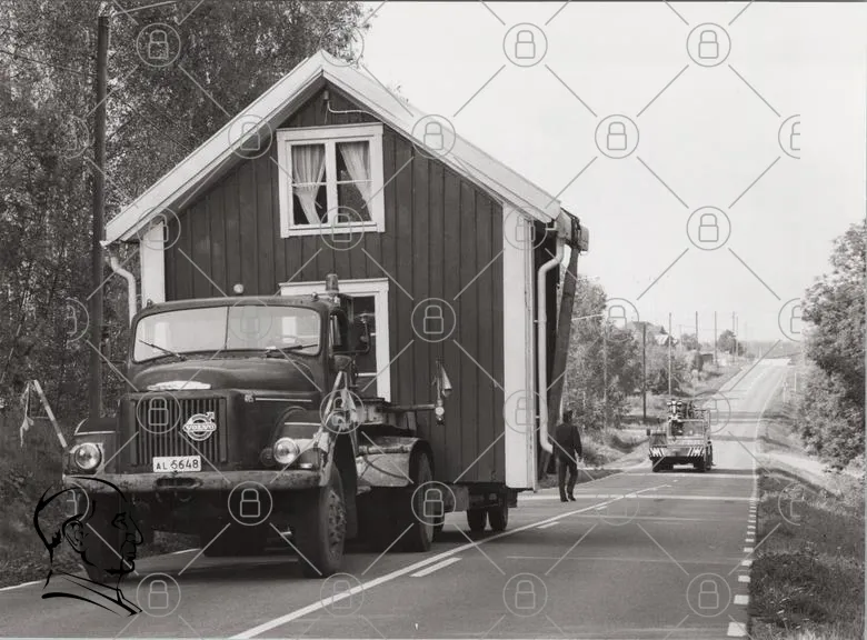 hus, lastbil, transport, väg, landskap, svartvit, byggnad, flytt, fönster, träd, man, lasta, motorfordon, landsväg, gammal, svensk, hem, flyttning, fordon, trafik, vägskylt, byggprojekt, traditionell, bostad, lasta hus, renovering, byggmaterial, hantverk, historia
