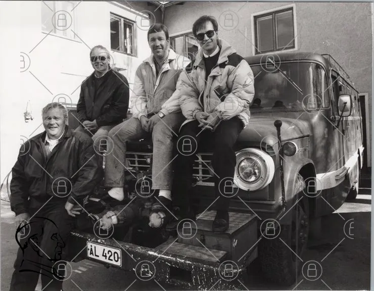 svartvit, gruppfoto, män, lastbil, jackor, solglasögon, leende, utomhus, vintage, fordon, nummerplåt, fönster, byggnad, avslappnad, retro, 1990-tal, stil, mode, vänner, samling