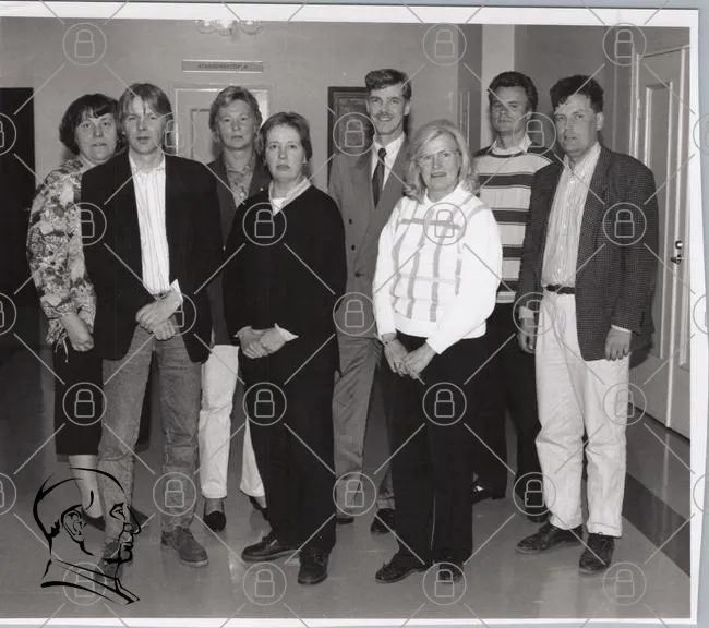 gruppfoto, svartvitt, människor, formella kläder, inomhus, 1990-tal, män, kvinnor, stående, porträtt, kontor, arbetsplats, grupp, åtta personer, leende, kavaj, tröja, byxor, skjorta, slips