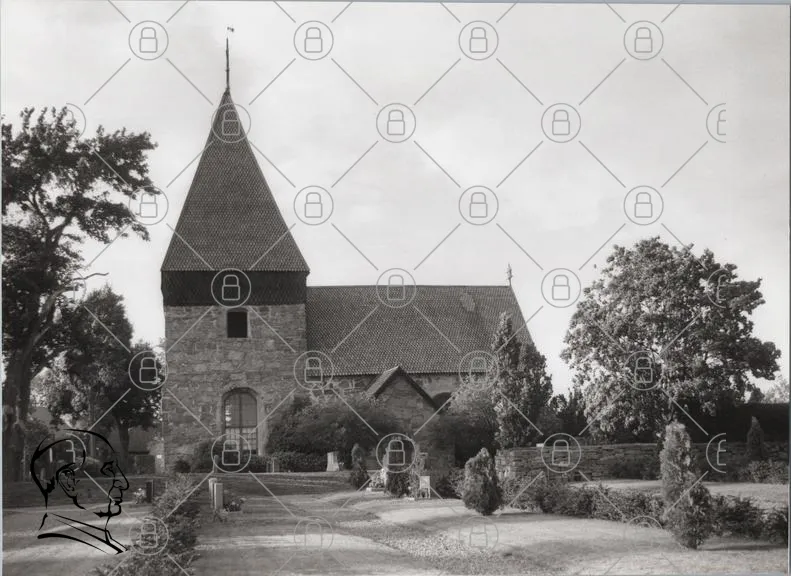 kyrka, byggnad, medeltid, sten, tak, torn, träd, landskap, grönska, väg, stenar, historia, arkitektur, gammal, kultur, natur, himmel, moln, entré, monument, svensk, landsbygd, tradition, lugn, stillhet, fotografering, svartvit, vy, detalj, utsikt