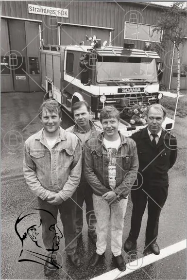 brandbil, Scania, fyra personer, gruppfoto, uniform, jeansjacka, svartvitt foto, brandstation, utryckningsfordon, porträtt, utomhus, regn, blommor, fordon, räddningstjänst