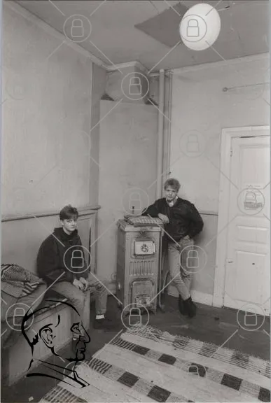två pojkar, rum, svartvitt, väggar, dörr, värmepanna, kläder, sittande, stående, inomhus, 1980-tal, ungdomar, möbler, golv, textil, stil, retro, interiör, belysning, atmosfär, enkelhet, vardag, nostalgisk, ungdomskultur, kompisar, avskildhet, känsla, tidlös