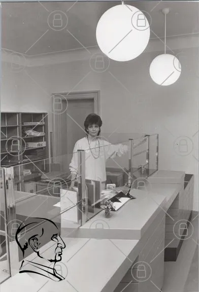 reception, kontor, kvinna, glasdisk, belysning, växt, skrivbord, postlådor, modern, svartvitt, professionell, arbetsplats, service, väntrum, kontorsmiljö, inredning, arbetsliv, kundservice, kontorspersonal, receptionister
