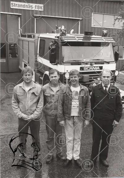 brandbil, Scania, fyra personer, gruppfoto, uniform, jeansjacka, svartvitt foto, brandstation, utryckningsfordon, räddningstjänst, män, utomhus, fordon, arbetskläder, brandman